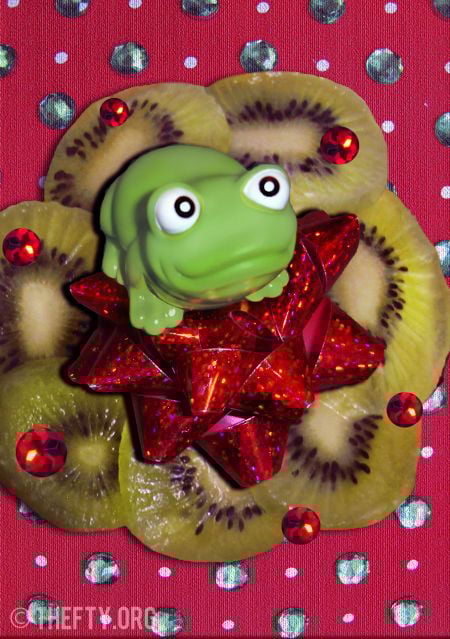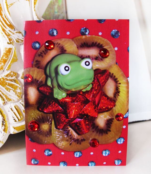 One Festive Froggy Christmas card, hand embellished with acrylic rhinestones or sequins (the embellishments may vary but they're always very pretty!). The card comes cellophane wrapped and includes a brown paper envelope. Blank on the inside.