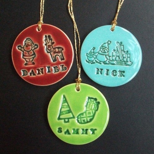 They are made from white earthenware clay and measure 60mm across. They are imprinted with a commercially available Christmas stamp and then glazed in a bright glossy glaze.