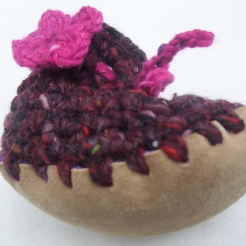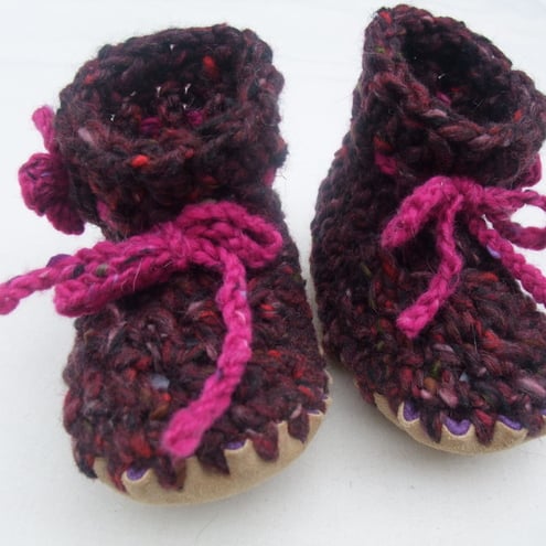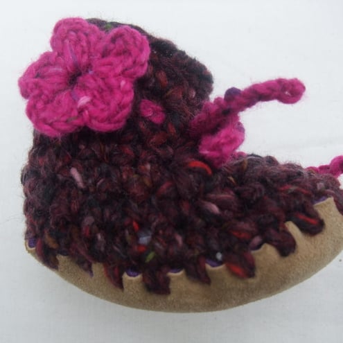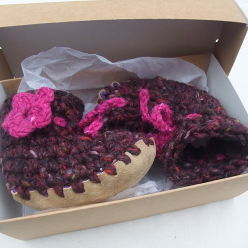 These funky little shoes will keep your baby's feet snug and warm and add a dash of colour to any outfit! Soft chunky wool and angora fabric with stretch for comfort and growing room. A perfect gift for a newborn baby girl.