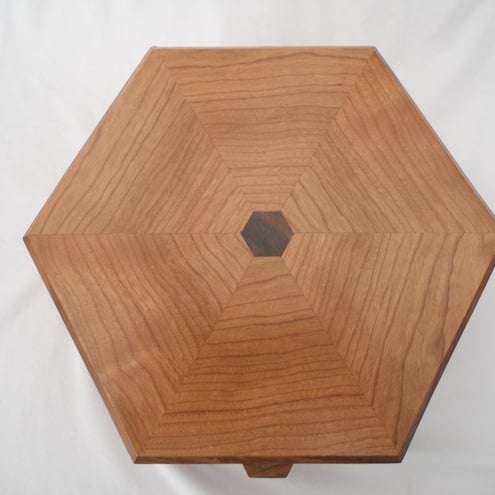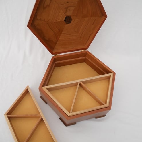A Hexagonal Jewellery Box veneered in English Cherry with Walnut edge,feet and centrepiece.