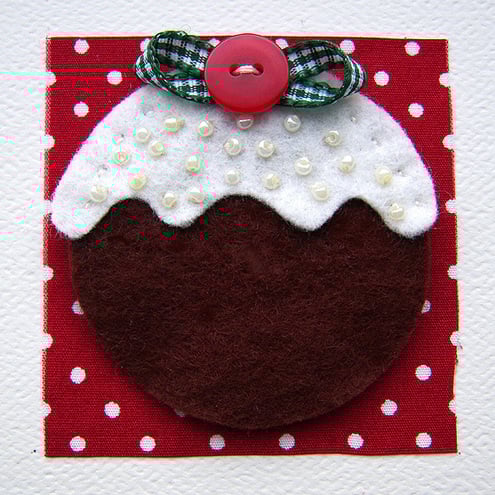 This is a lovely festive greetings card featuring a felt Christmas pud adorned with beads and finished with a gingham ribbon and button detail. It is mounted on red polka dot fabric and placed in the square aperture on cream card.