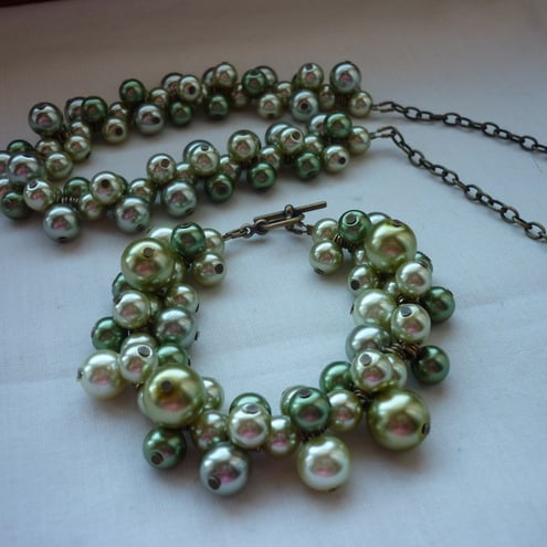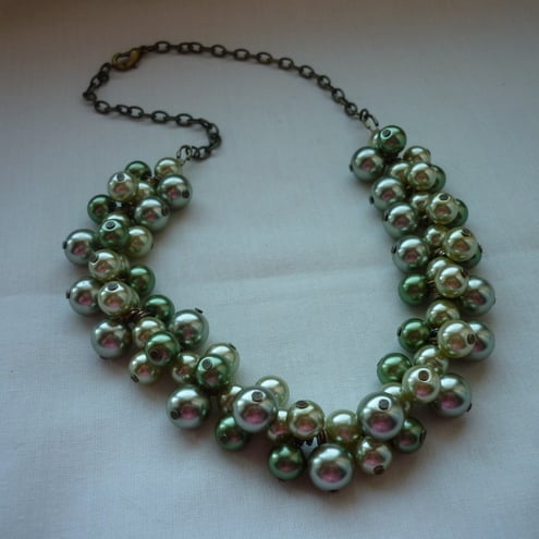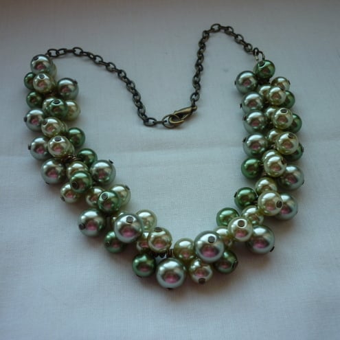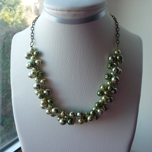 THE NECKLACE HAS BEEN MADE WITH 10MM, 8MM AND 6MM GLASS PEARLS IN SHADES OF SAGE GREEN, SILVERY LIME GREEN AND MEDIUM GREEN AND FINISHED WITH ANTIQUE GOLD TRACE CHAIN, LOBSTER CLASP AND FINDINGS.
