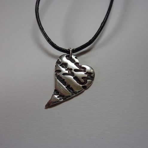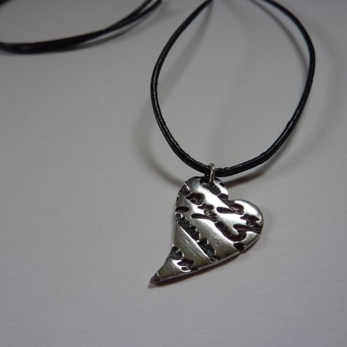 This handmade fine silver heart pendant has a personal feel as it contains part of a loveletter written across the front. The heart has been oxidised to show off the texture and tumbled to achieve a smooth polished surface. Hung on a on a black leather cord this piece is suitable for everyday wear.