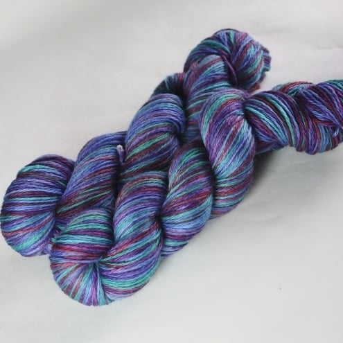 Hand painted yarn in shades of jade/emerald green, chestnut/burgundy, purple and blue, this soft and squishy yarn should make wonderful socks, or other projects requiring sock-weight yarn. This yarn is very similar to the 100% superwash merino, however it is slightly thicker and has 20% nylon content for strength. This yarn has a lovely sheen that the camera has really picked up (colours are probably most accurately depicted in the second photograph) The yarn has been reskeined as shown in the first two phootographs is shown before reskeining in the third photograph, for reference only. There is one skein left.