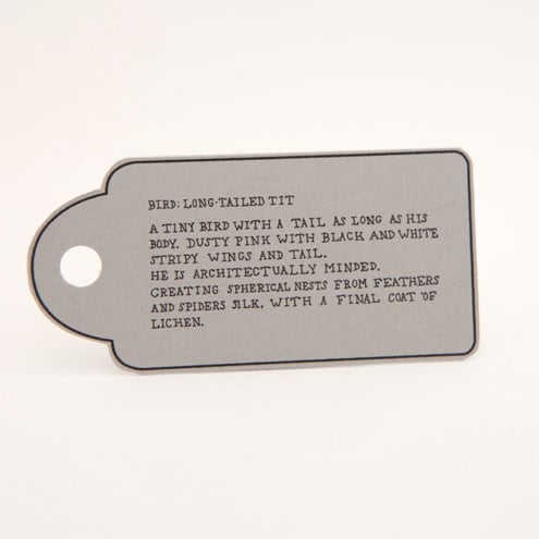 They come in a grey/black jewellery box made from recycled cardboard. With a handmade tag with information about the bird.