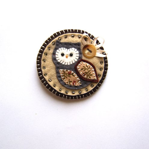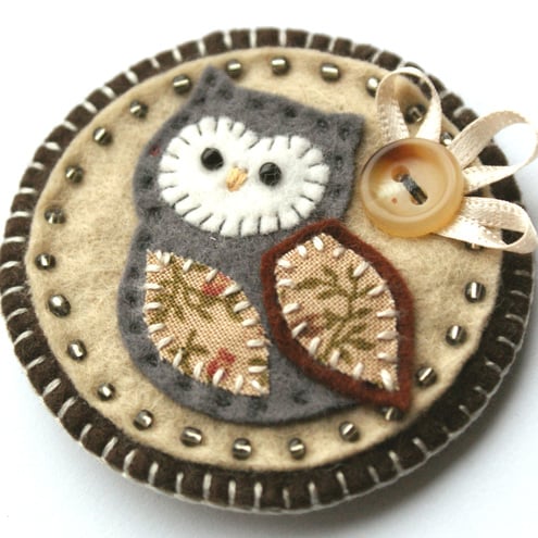 It features a little felt owl with appliqued wing and belly in pretty cotton print fabric. It is mounted onto a mink brown felt base which is edged with pretty coordinating seed beads. It is further mounted onto a dark brown felt backing and is finished with a button and ribbon detail. It has a brooch backing for easy attachment.