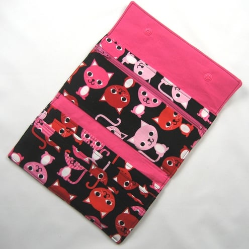 This purse measures approximately 19cm by 10cm when closed and 19cm by 26cm when fully open. It IS made from premium cotton fabric and is lightly padded. It has 6 pockets for cards and a larger pocket for notes, plus a zipped compartment for coins. It fastens with two bright pink poppers and would make a lovely gift if you can bring yourself to give it away.