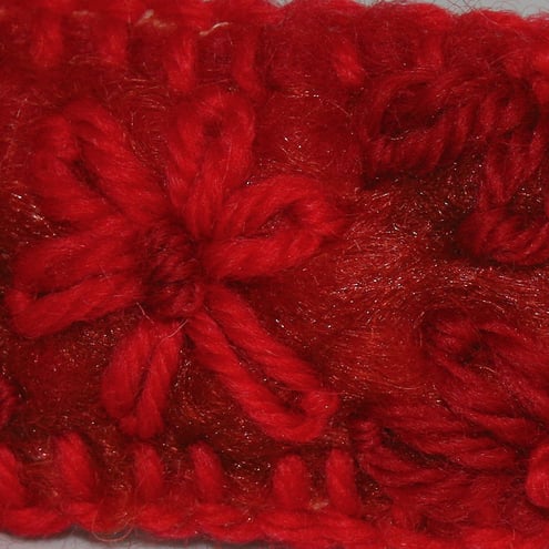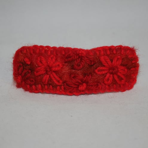 Merino, and other wools, combined with mohair and silk fibres, have been needle felted to create the background for this barrette. Several layers of differing and contrastting shades, have been built up on a base fabric, giving a depth of colour to the design. The final two layers are silk fibres. Tapestry wools, in shades closely matching those in the felt, have been used to edge the barrette in blanket stitch and embroider a simple daisy motif, scattered at random across the barrette. The embroidery has been chosen to enhance the felt which is a feature of this item.