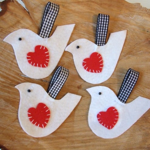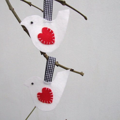 They are made from white felt with a contrasting red felt heart wing which has been hand sewn. A black and white gingham ribbon is attached for hanging. They have little black sequin eyes.