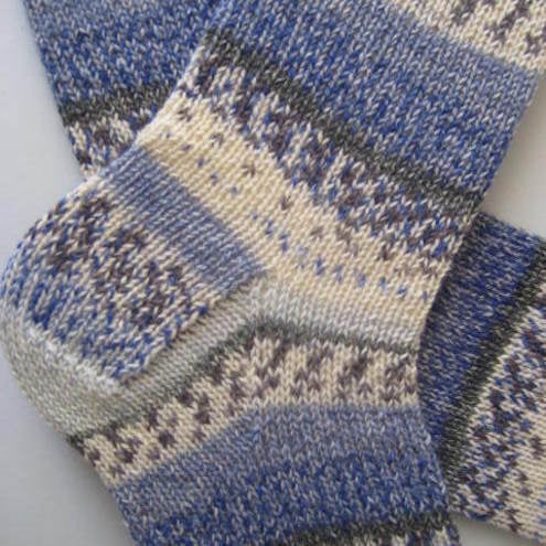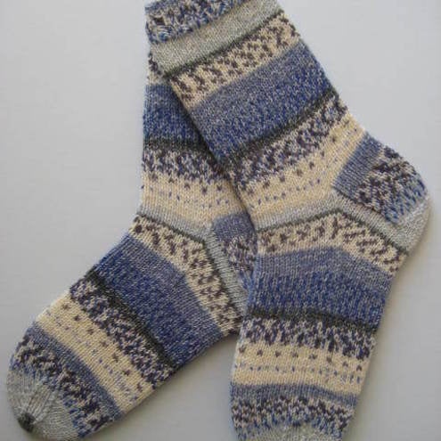 I made this pair from Opal Circus self patterning sock yarn, 75% wool 25% polyamide. The colours are wintry stripes of cream, greys and blues with fairisle patterning. Warm and durable, these socks will keep your feet cosy throughout the year.