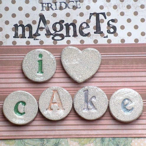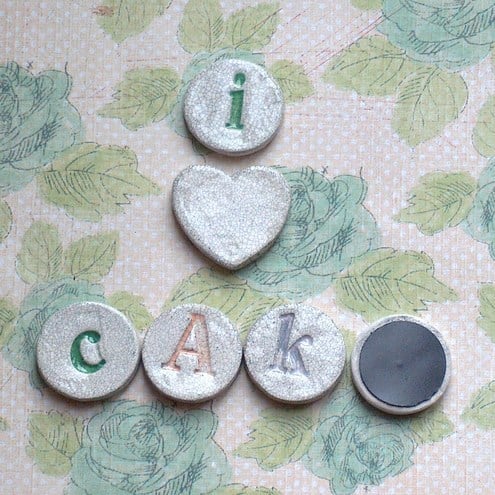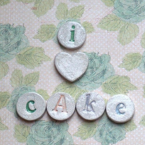 Individually handmade ceramic fridge magnets, reading 'I Love Cake'. Each letter is stamp with my vintage stamps, and coloured using lovely coloured under glaze, then finished in my trade mark crackle glaze. The magnets come packaged with lovely shabby chic style backing and protected in cellophane.
