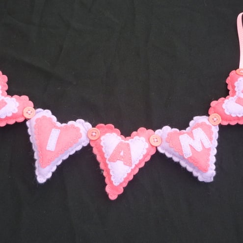 Hand stitched felt, price includes name up to 5 letters, in scalloped hearts.