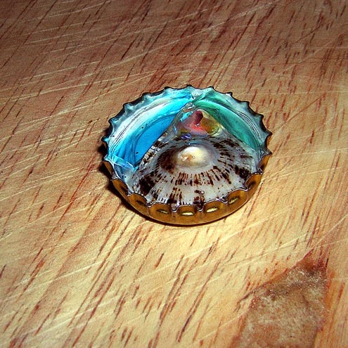 5 Lovely unique brooches made entirely from recycled items. These are funky little beer bottle tops filled with shards of stained glass, shells, found items and costume jewelery covered with a watery topping of resin. Each one is unique and its a lucky dip what you will find in yours! They make a perfect small gift.