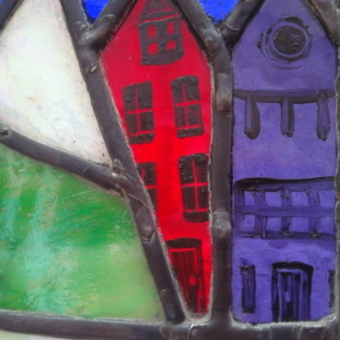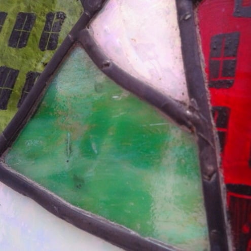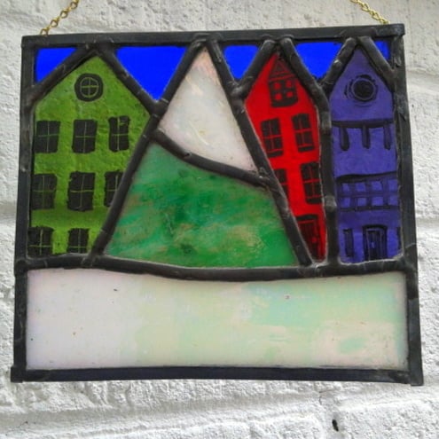 Add a seasonal touch to your home for years to come with a lovely quirky little winter village scene. The houses, Christmas trees and snow are all made from recycled and reclaimed stained glass, using traditional leading techniques and painted detail. The kiln fired glass paint is bonded to the glass and will not fade or rub off. The Christmas tree and white snow uses glass with a fantastic iridescent lustre.