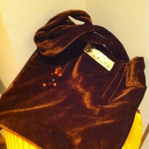 Gigi is wearing a pair of brown velvet trousers and a patterned light brown top with a peplum. The top is trimmed with brown velvet and she has brown shoes, decorated with sequines. She comes in a brown velvet carry bag, lined with the same fabric as her top.