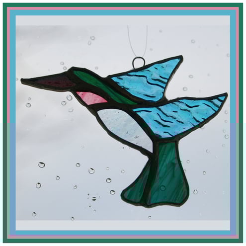 Really pleased with this little bird. .It looks lovely hanging in the window where the different textures and iridescent colours of glass give it movement and sparkle as it catches the light.