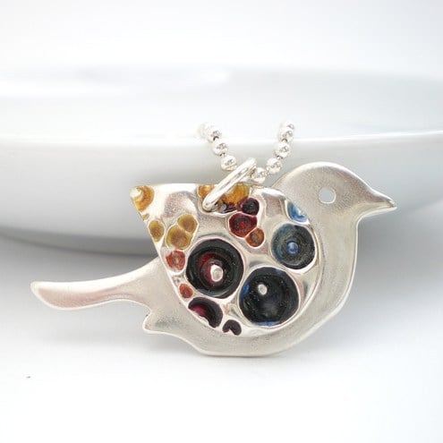 Cute silver bird pendant with a spotty texture wing. Inspired by nature and made from recycled silver he makes a great eco friendly choice!
