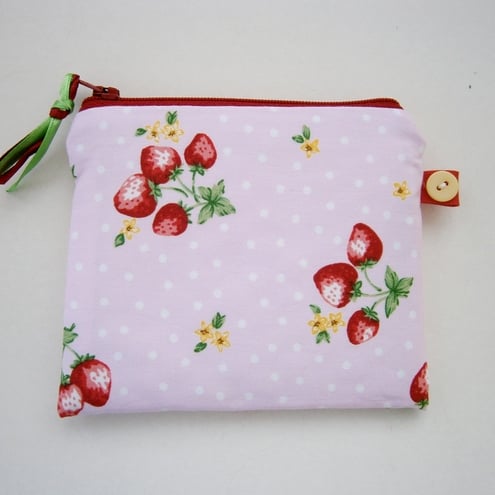 Cute little strawberry printed fabric coin purse, perfect for your coins, notes and cards.