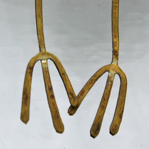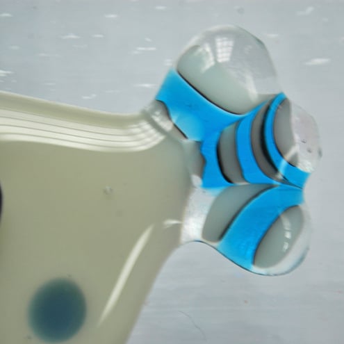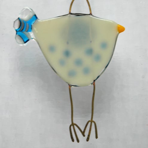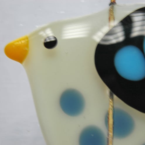 Created from layered Bullseye glass in my Whitstable workshop. This bird has a lovely flower detail on the wing and the blue spots have a beautiful transparency. The body, wing, beak and tail feathers are all hand cut and fused separately before being joined in subsequent firings with the brass hanging wire secured in place. I make adjustments until I’m satisfied with the look and the whole piece is given a final firing to achieve a perfect finish. The wire feet are then soldered in place and hammered to shape. A pale blue gingham ribbon is attached to complete the design.