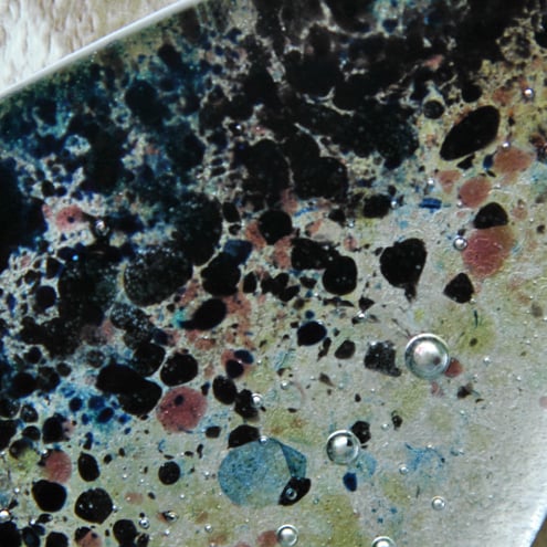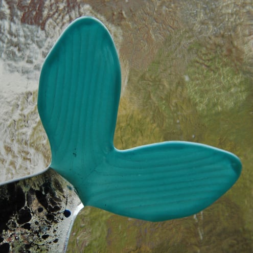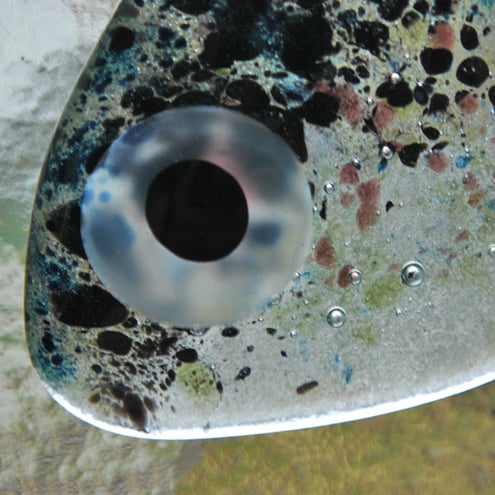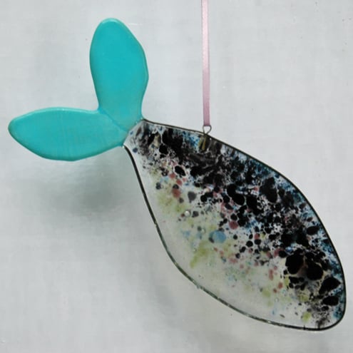 Created from layered multicoloured Bullseye sheet and ground glass in my Whitstable workshop. The body, eye and fins are all hand cut and fused separately before being joined in another firing with the hanging wire secured in place. Final adjustments are made to the shape and then the whole piece is fired again. This design has a beautiful metallic quality to the speckled detail and the tail fins really shimmer. A pale pink satin ribbon is attached to complete the design.