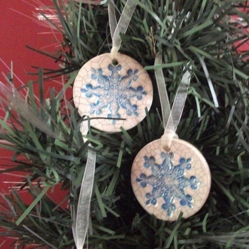 This set of 3 crackled snowflake decorations are made from white earthenware clay and twice fired to a top temperature of 1100 degrees so are nice and strong.