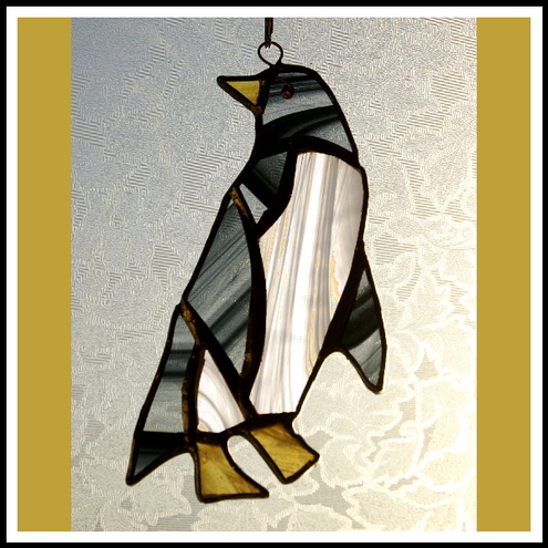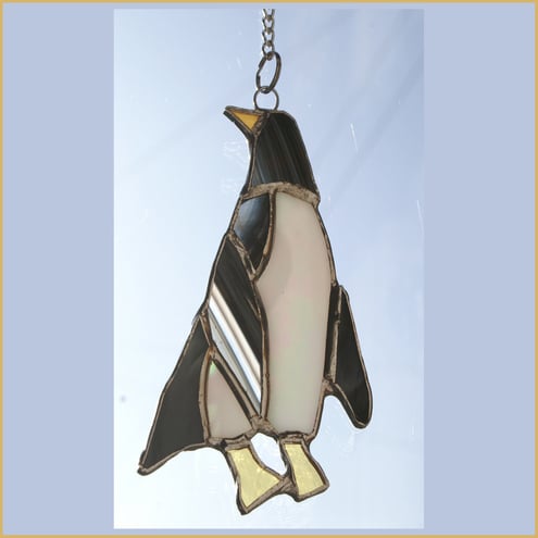 The suncatcher hangs from a little chain which is securely attached to the top of the penguin's head. It is 12cm high and 7cm wide.