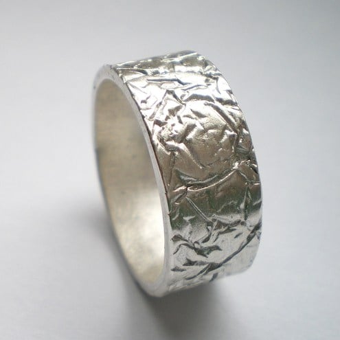 This fine silver (0.999 silver) ring is decorated with a crumpled silver pattern.