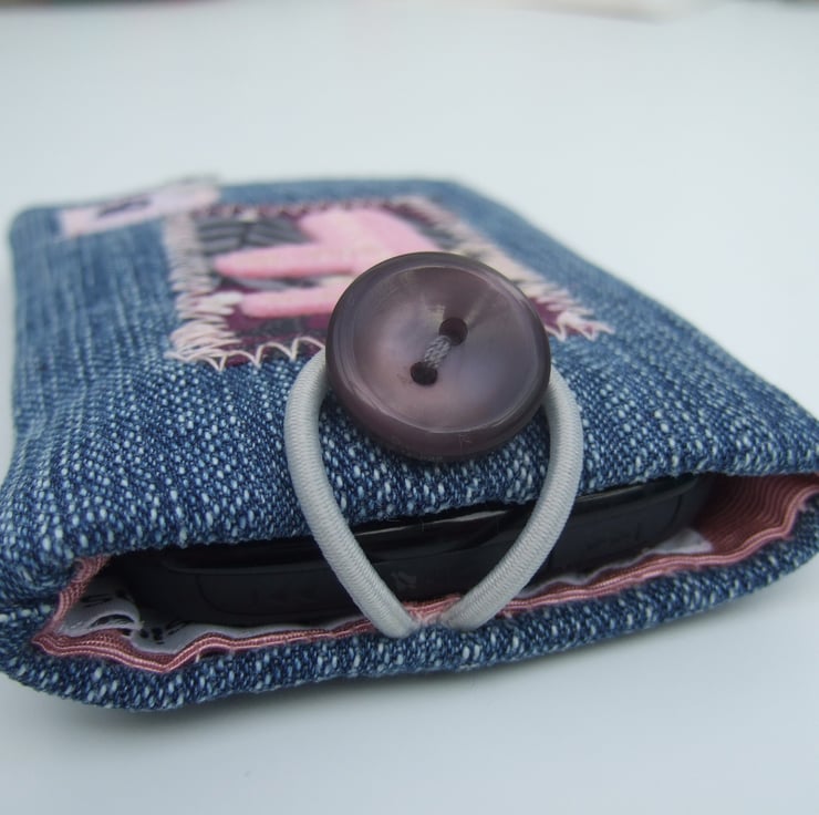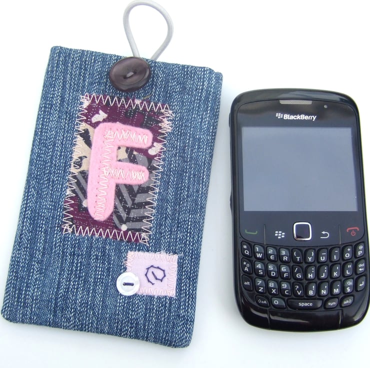 I have upcycled demin and fabric to create this unique phone case, decorated with the letter 'F' . I have added pink stitching detail to match the pink felt letter and finished with a button closure.