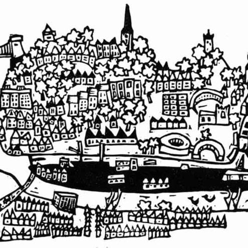 A canvas shopping bag with a black and white image of Bristol screen printed on to it. We love Bristol!!