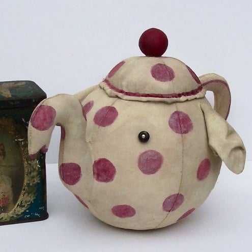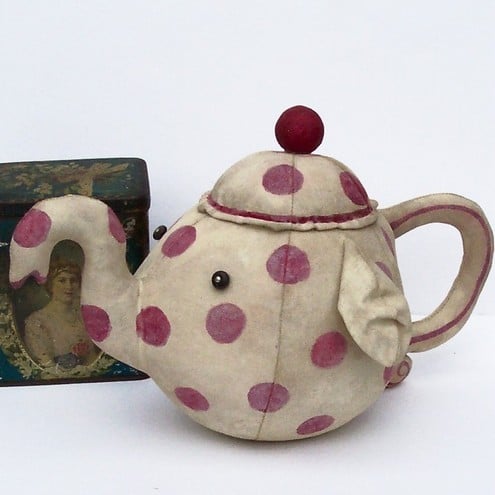Teapot is made from linen that has been painted with creamy coloured acrylic paint. I then potato printed on the spots and then gave the whole lot a bit of a sand and sloshed on lots of coffee.When dry, I then I re-coated it with more cream acrylic paint and gave the spots another watery coat of crimson paint. The knob is papier mache and the eyes are grey mother of pearl, vintage, boot buttons and I had more fun than an elephant in a cake shop!