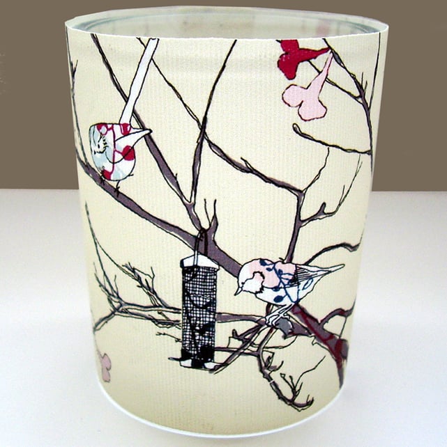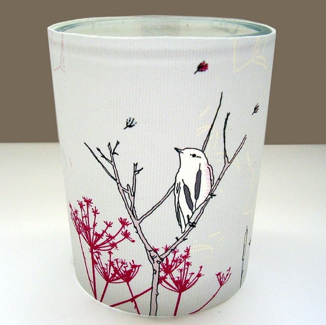 My original littlebirdy designs have been printed onto fire retardant, washable fabric which is then wrapped around a glass tealight holder.