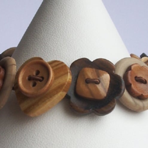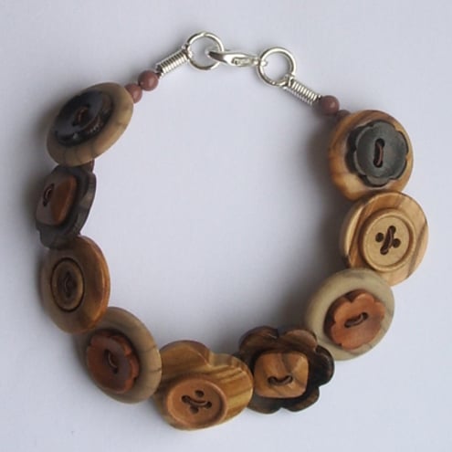 This distinctive button bracelet is rich with an assortment of olive and beech buttons. These are threaded onto jewellery wire, which secures at the end with a silver plated lobster clasp fastener.