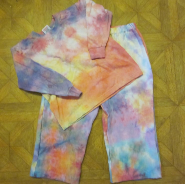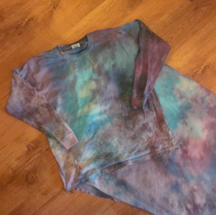 RESERVED for muddypaws This is a custom slot for lounge wear in the colourway 'Flow', a combination of blue, turquoise and purple. The set includes a hand dyed long sleeved t shirt (usually Fruit of the Loom or JHK ) with matching elasticated winceyette (soft cotton flannel) trousers in this colourway. Trousers will be handmade to your specified length.
