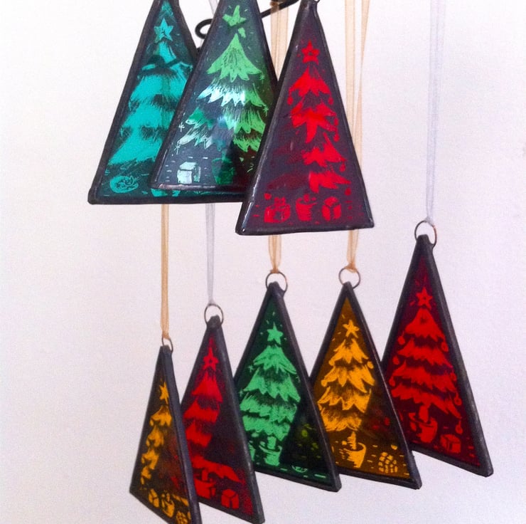 These unique Christmas decorations have been made by painting coloured stained glass with black glass paint and scratching off the dried paint to reveal the colour underneath. Just like having a small shard of a bigger stained glass window hanging in your home. Will look lovely on your tree, in your window or where light shines from behind - to reveal the picture.