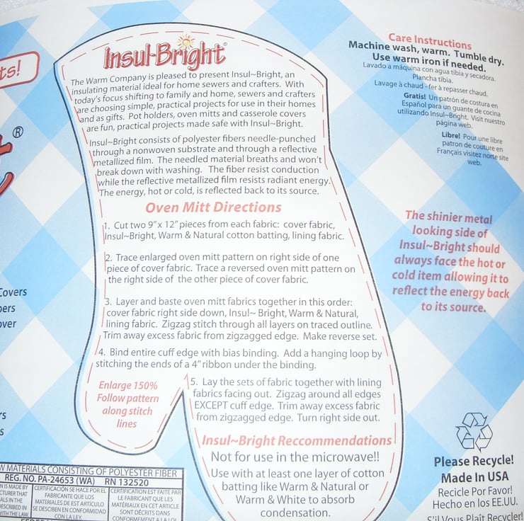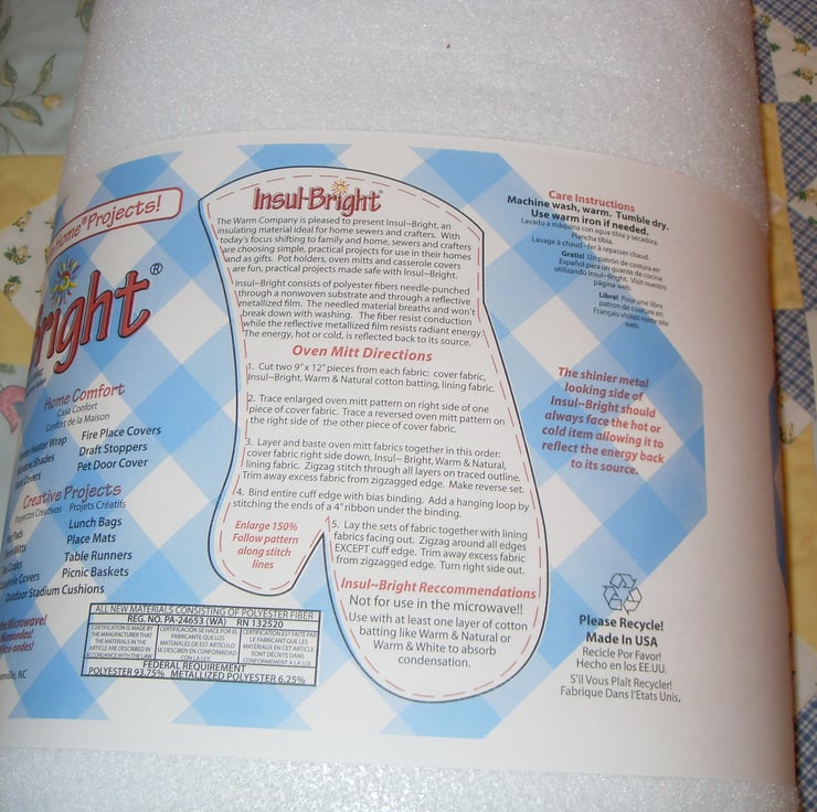 The printed details shown in the picture include full instructions for making an Oven Mitt! NB: At least one layer of cotton wadding is recommended with Insul Bright when used as Oven Mitts or Pot Holders (to absorb condensation).