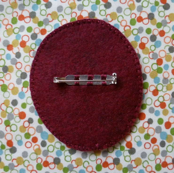 A cute spotty mushroom sits in the centre and is appliqued on to dark mossy green cotton with shimmery silver thread. The cotton has been appliqued on to burgundy felt using the same silver thread. The brooch is edged with blanket stitch in burgundy. Another layer of burgundy felt has been used to back the brooch, and onto this I have sewn a brooch pin.