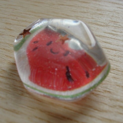 This cute brooch features a one-off handmade chunk of resin . The resin piece has a kawaii watermelon decal embeded within with a sprinkle of irridescent glitter and two little stars. It is finished off with a steel brooch back. Really kitsch and fun to wear.
