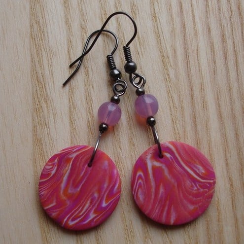 The discs themselves are made from my own marbled fimo blend - a wonderful and very striking pattern in orange/white/purple clays.