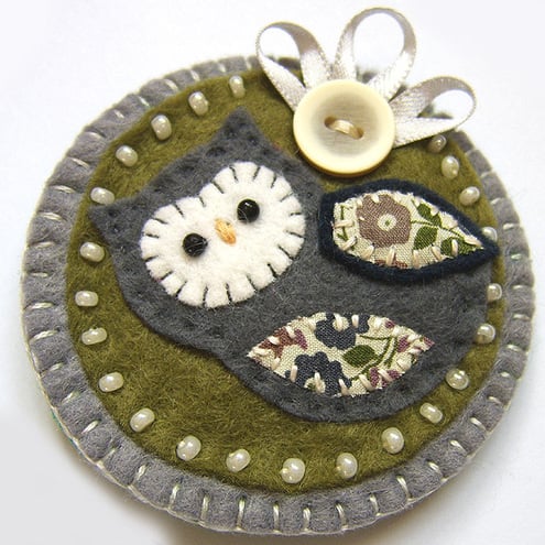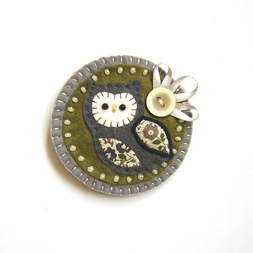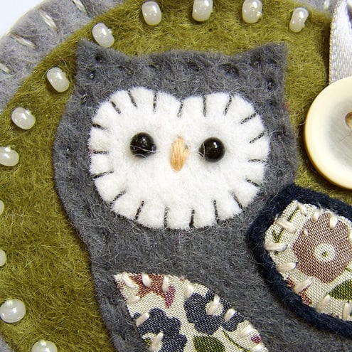 It features a little felt owl with appliqued wing and belly in pretty Liberty print fabric. It is mounted onto an olive green circular felt base which is edged with pretty cream seed beads. It is further mounted onto a grey felt backing and is finished with a button and ribbon detail. It has a brooch backing for easy attachment.
