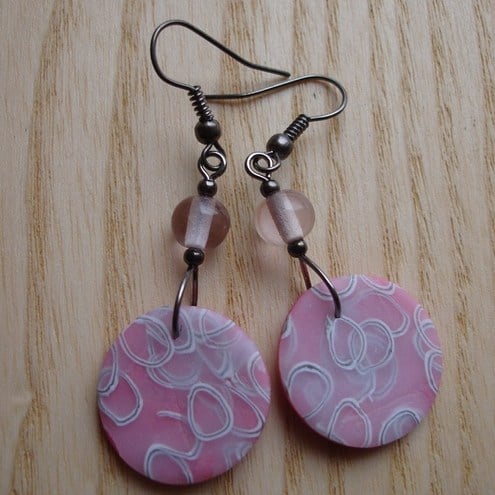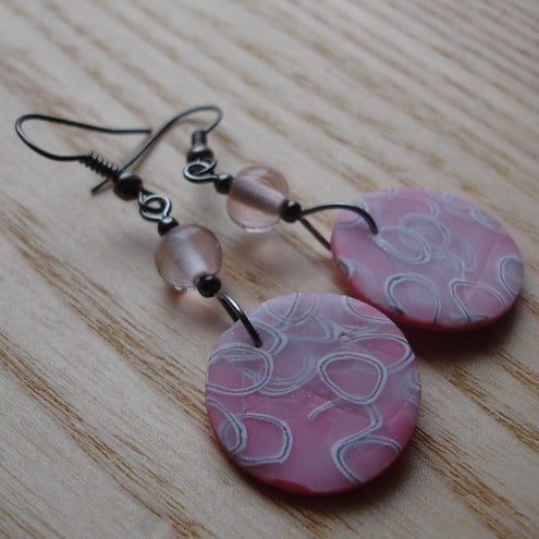 The discs themselves are made using my own millefiori fimo cane - a wonderful and very striking loop pattern laid over a pink marbled clay.