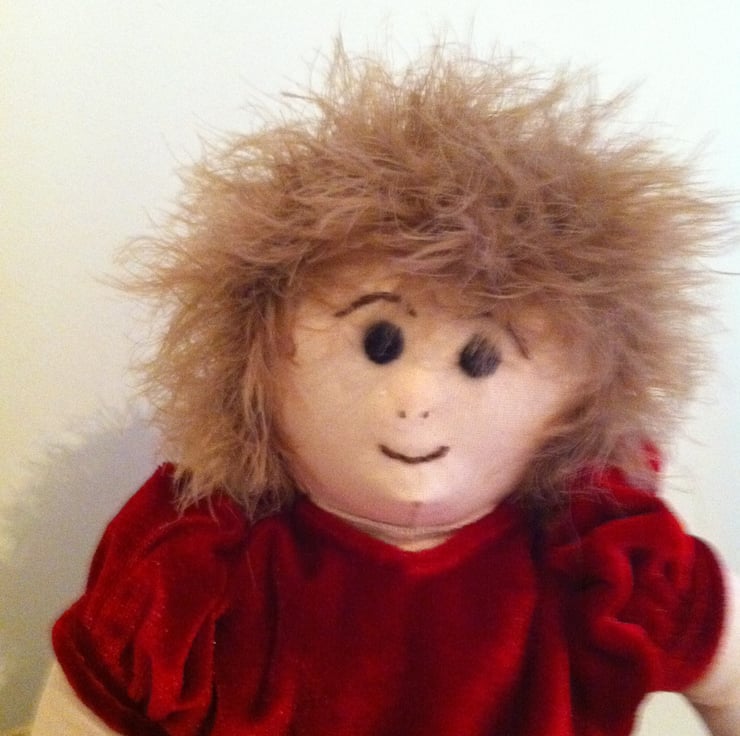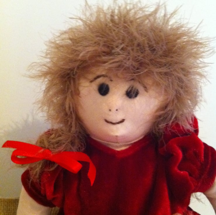 Evie is quite a shy rag doll but she looks really beautiful dressed in her full length crimson velvet dress. The dress is decorated at the waist with hand felted flowers and has a full skirt and puffed sleeves. Evie has cream socks and pants and soft black shoes decorated with red cupped sequins. She comes in a jute bag decorated with her name. A lovely Christmas present for a little girl.