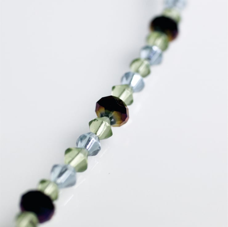 This necklace s made from purple iris multi-faceted crystal beads interspersed with pale green and pale purple clear bi-cone crystal beads and is approx 44cm in length.