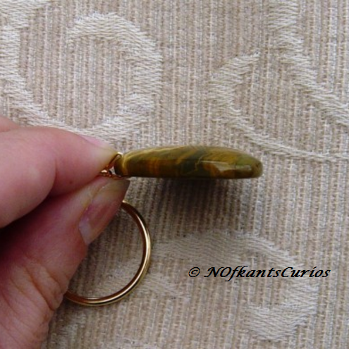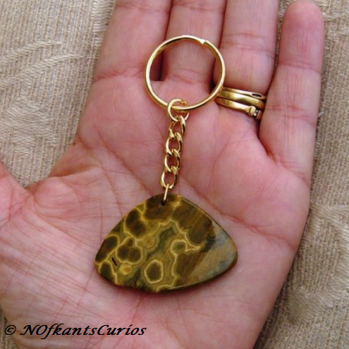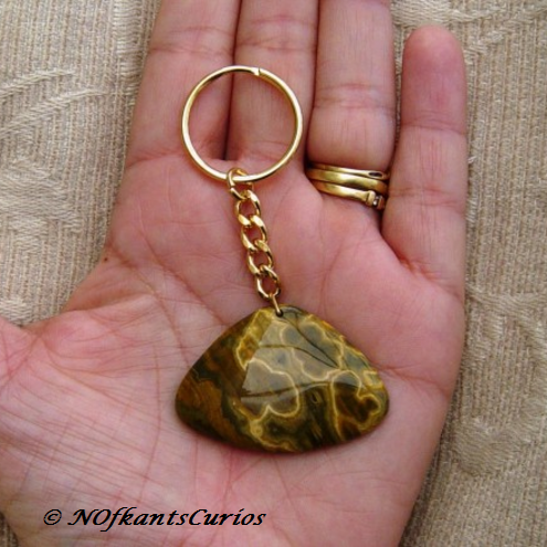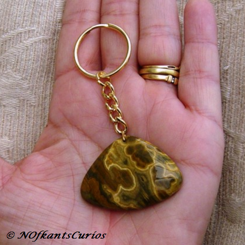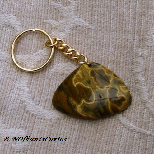 The Walnut toned Ocean Jasper has been simply drilled through which I have placed a goldtone triangle bail and goldtone curblink key chain. To complete this item as a usable key,ring, the item has been finished off with a 2.5cms diameter goldtone round split ring.