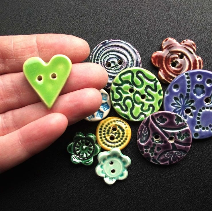 This set of handmade buttons have been created from white earthenware clay, fired once then decorated with biright glossy glazes and fired again.