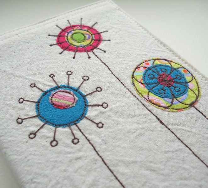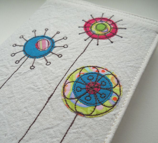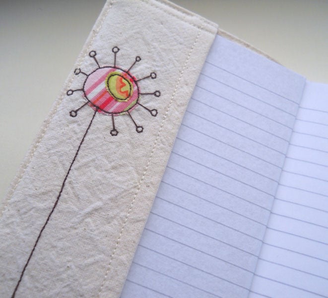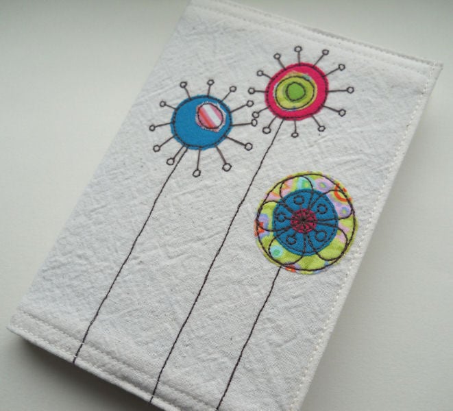 this notebook features 3 bright stylized flowers on the front cover, and 1 on the inside flap. they are in turquoise, pink and printed cotton fabrics, layered and appliqued onto pre-washed calico, before i draw onto them with free machine / free motion embroidery.