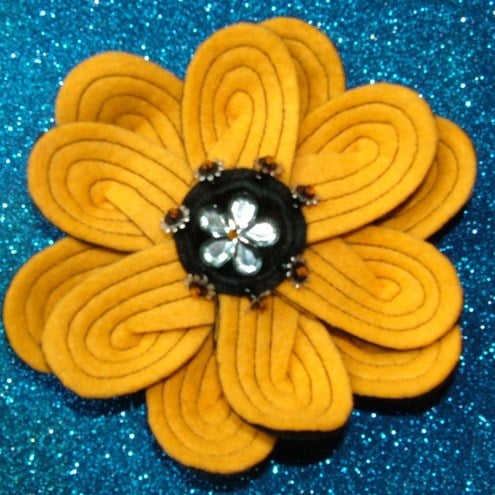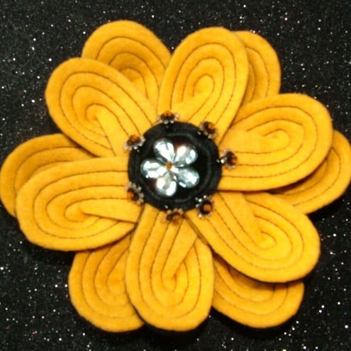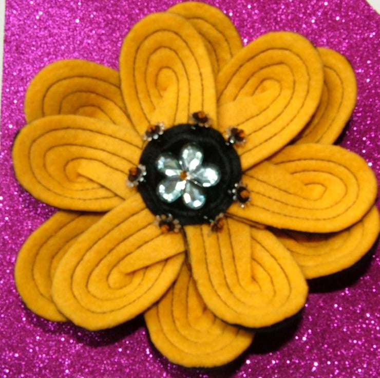 THIS VIBRANT YELLOW AND BLACK CORSAGE HAS 12 SHAPED FELT PETALS, WHICH HAVE BEEN HAND STICHED INTO PLACE TO PRODUCE A STUNNING ACCESSORY.