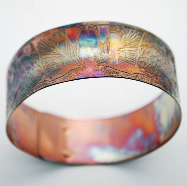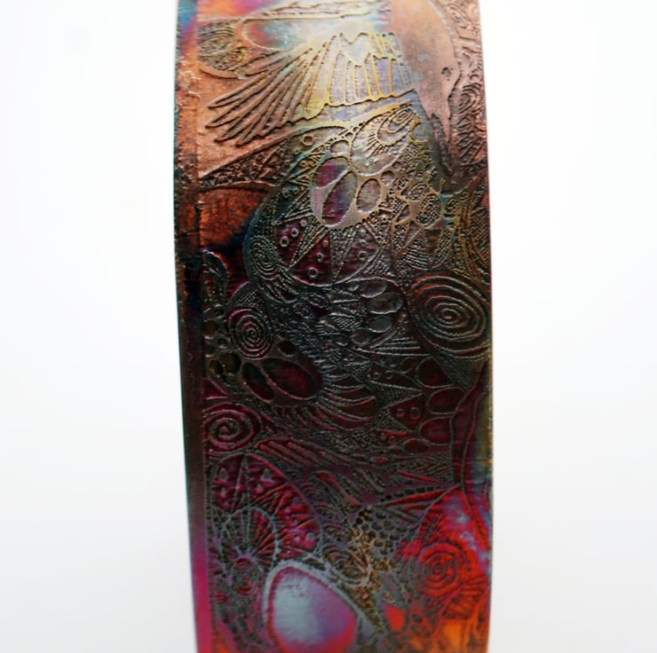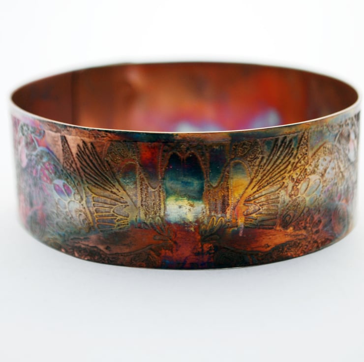 This etched copper bangle bearing imagery of flying rooks has been heat treated to create a vibrant multicoloured patina: this will deepen over time. I have developed a technique of literally 'painting' with a flame to manipulate the shape and direction of the colours. Although there is a degree of control, each piece is unique, as the colour patina cannot be replicated exactly. This bangle is a full circle which is rivetted together at the rear using two copper handmade rivets. Tjis will slip over the hand and lie loosely around the wrist, without falling off, due to the size of the hand. These can be made smaller or larger to fit slimmer or thicker hands and wrists upon request.