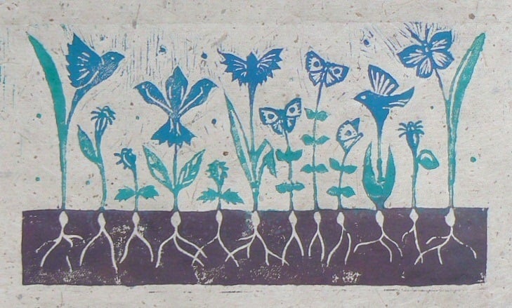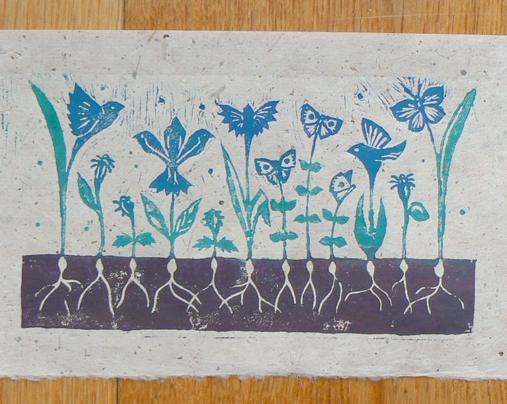 I have hand printed this linocut in several coloured inks which mix together in one layer. It is printed on handmade paper made from lokta and hemp, which I think really suits the image.