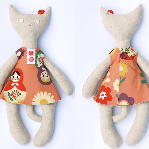 Oatmeal linen cat, with polyester filling and button eyes. Red flower button in 'hair'.