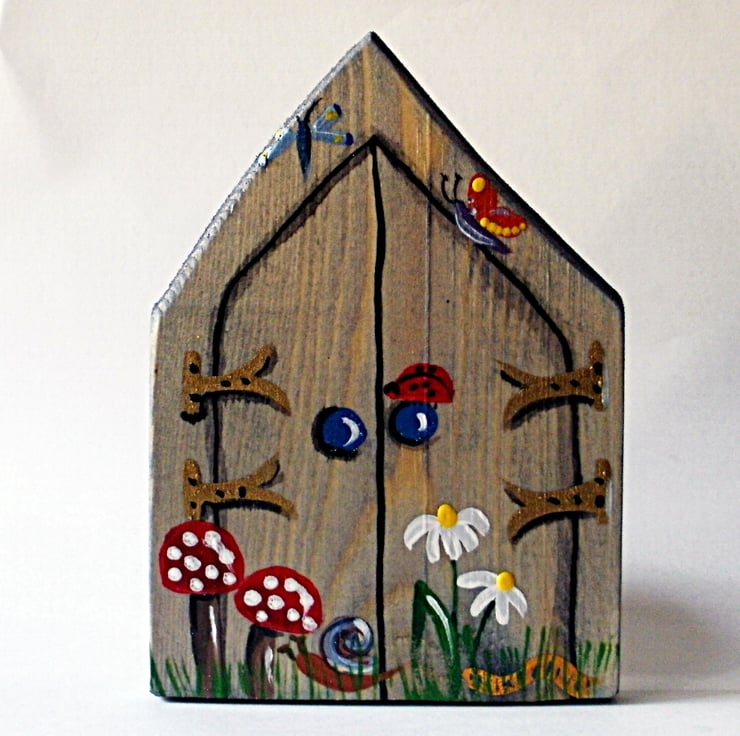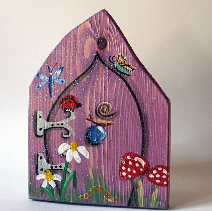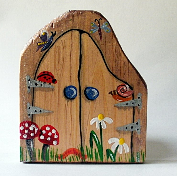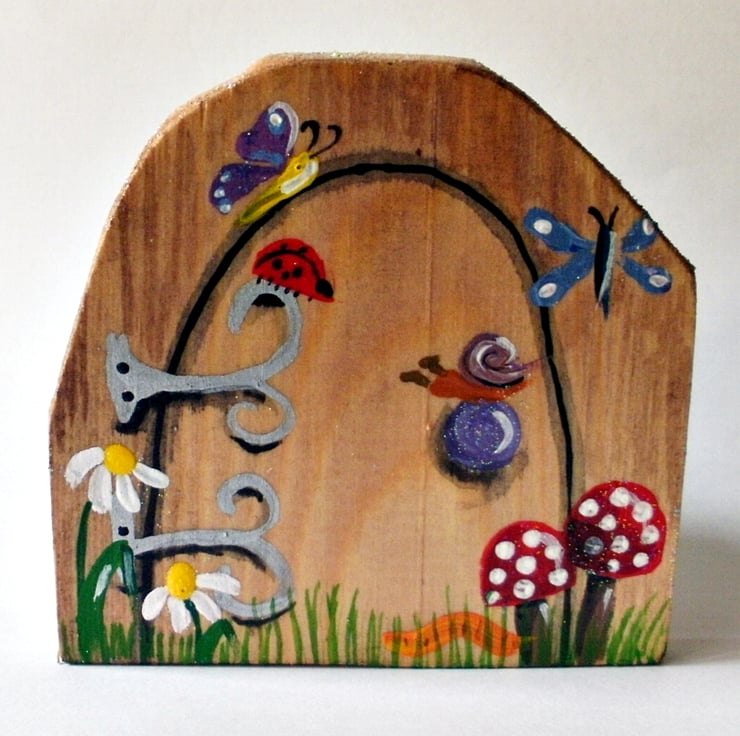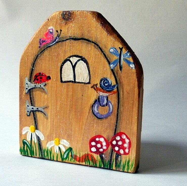 These are the Medium sized Wee Folk Doors, they are made of wood and painted free hand so no two are ever the same. They are approx 4 x 4.5 inches. They come with a sticky backed pad and look good above a door frame, on a skirting board or anywhere you want the wee folk to enter.